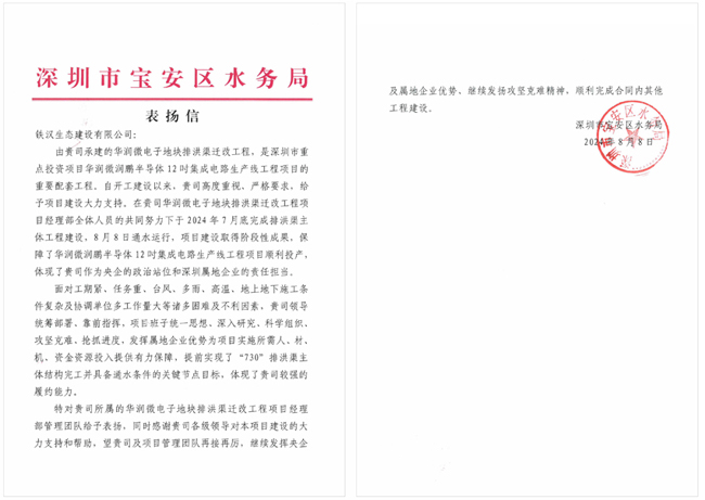 宝安区水务局《表扬信》指出,自项目开工建设以来,铁汉建设高度重视、严格要求,给予项目建设大力支持。期间,面对工期紧、任务重,台风、多雨、高温、地上地下施工条件复杂及协调单位多、工作量大等诸多困难及不利因素,铁汉建设统筹部署、靠前指挥,项目班子科学组织、攻坚克难、抢抓进度,发挥属地企业优势为项目实施所需人、材、机、资金资源投入提供有力保障,提前实现了“730”排洪渠主体结构完工并具备通水条件的关键节点目标,体现了较强的履约能力。8月8日,项目顺利通水运行,保障了华润微润鹏半导体12吋集成电路生产线工程项目顺利投产,体现了作为央企的政治站位和深圳属地企业的责任担当。